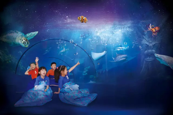 你是不是也和小怪一样,幻想过这样的场景:在恒温的海洋馆“海底隧道”里,躺在睡袋里,睁开眼睛就看到鲨鱼、海龟、石斑、水母等海洋生物在你四周游来游去…