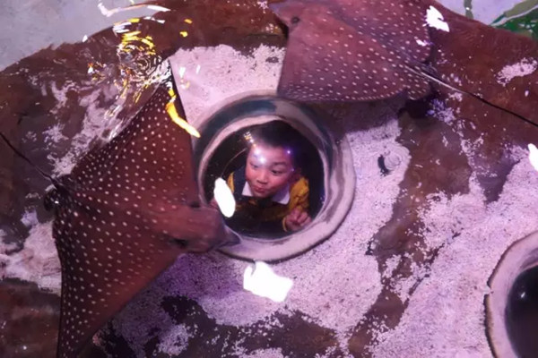 小朋友们还可以把头伸到“泡泡”缸,探进小脑袋,和鳐鱼亲密接触哦!